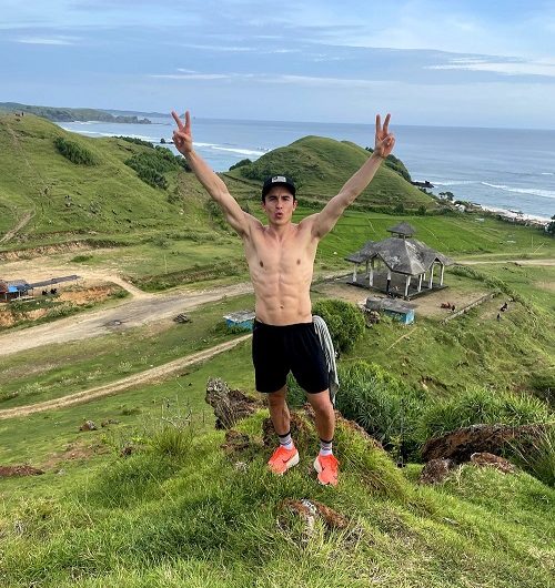 Sambil telanjang dada, Marc memperlihatkan tubuh laki-laki yang sempurna dengan otot perut kotak-kotak yang berjumlah 8.