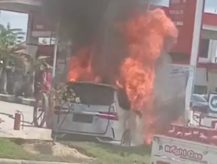 EDISIINDONESIA.com – Mobil minibus jenis Daihatsu Xenia berwarna silver terbakar saat menunggu giliran mengisi bahan bakar minyak (BBM) di SPBU Jalan Malaka, dekat Bundaran Tank Anduonohu, Kendari, Sulawesi Tenggara, Rabu (1/6/2022).