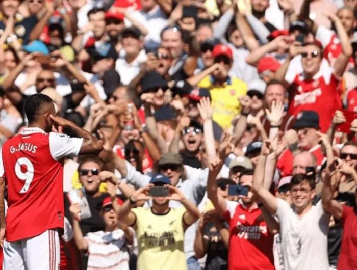 Selebrasi penyerang Arsenal asal Brasil, Gabriel Jesus setelah mencetak gol kedua timnya dalam pertandingan pekan kedua Liga Inggris antara Arsenal vs Leicester City di Stadion Emirates, London pada 13 Agustus 2022. Arsenal.com