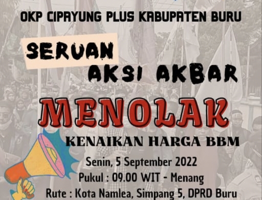 Dari pamflet yang tersebar, OKP Cipayung Plus Buru akan menggelar aksi “Menolak Kenaikan Harga BBM”, di Kantor DPRD Buru, pada Senin, 5 September 2022, mulai pukul 09.00 WIT sampai menang.