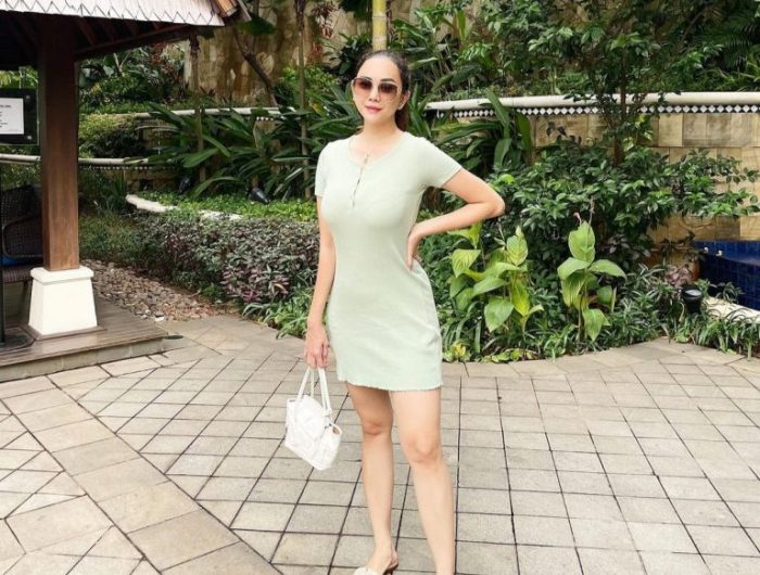 Pelantun lagu Mari Bercinta ini berbalut kaos ketat berwarna hitam tanpa lengan, dipadukan dengan rok mini warna hijau yang mengikuti bentuk bokongnya.