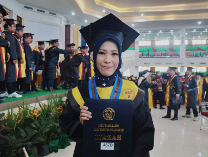 “Alhamdulilah sangat senang sekali, tidak bisa dijabarkan dengan kata-kata untuk kebahagiaan ini dan tidak menduga bisa menjadi wisudawan terbaik UHO Kendari,” katanya usai mengikuti prosesi wisuda, bertempat di Gedung Auditorium Mokodompit UHO Kendari.