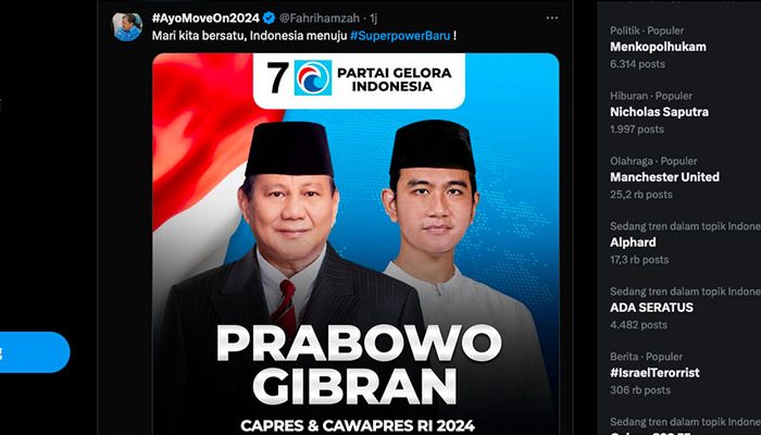 Bahkan Wakil Ketua Umum Partai Gelora, Fahri Hamzah mulai terang-terangan mengunggah poster Prabowo-Gibran dengan predikat sebagai calon presiden dan wakil presiden. Poster dipamerkan di akun media sosial X pribadinya pada Jumat petang (20/10).