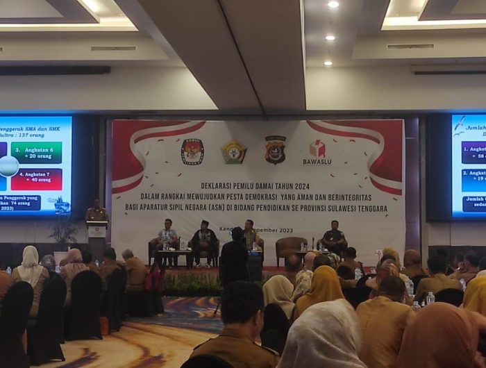 KENDARI, EDISIINDONESIA.id – Pemerintah Provinsi (Pemprov) Sulawesi Tenggara (Sultra) melalui Dinas Pendidikan dan Kebudayaan (Dikbud) menggelar deklarasi Pemilu damai tahun 2024 bagi ASN, Kepala Sekolah, perwakilan siswa/siswi SMA/SMK/SLB se-Sultra, Selasa (7/11/2023).