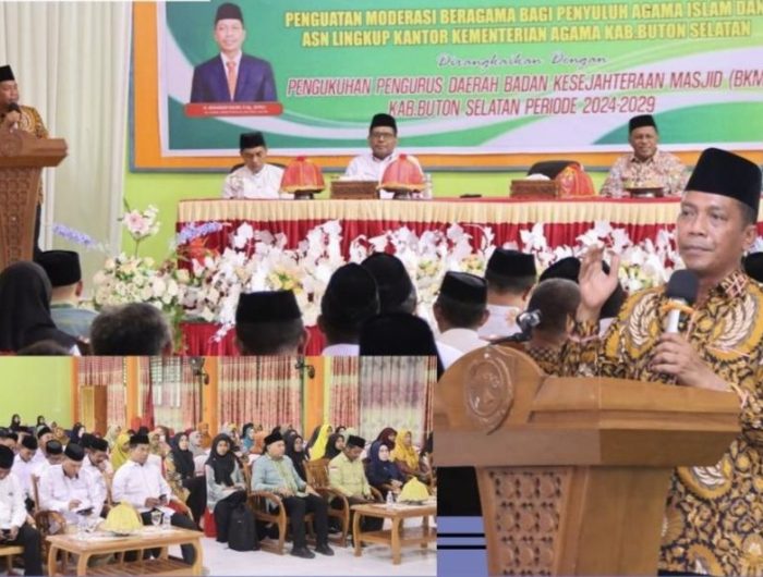 KENDARI, EDISIINDONESIA.id – Kakanwil Kemenag Provinsi Sulawesi Tenggara (Sultra), H. Muhamad Saleh didampingi Kepala Kankemenag Buton Selatan, H. Mukhtar memberikan penguatan Moderasi Beragama bagi Penyuluh Agama Islam dan Aparatur Sipil Negara (ASN) di lingkungan Kantor Kementerian Agama Kabupaten Buton Selatan.