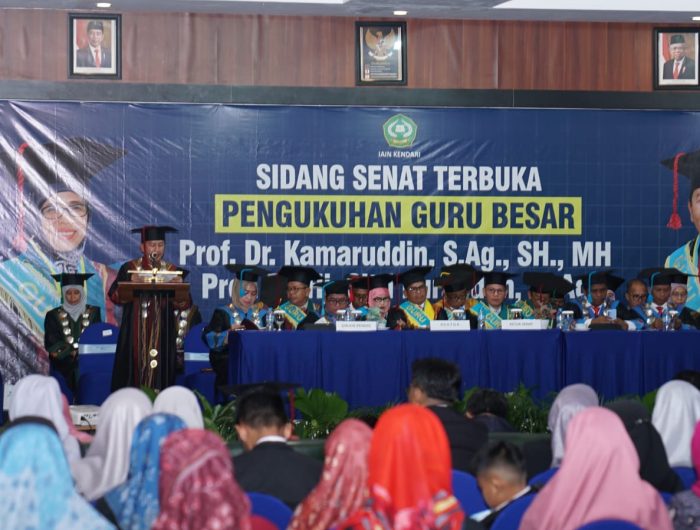 Acara pengukuhan ini dipimpin langsung oleh Rektor IAIN Kendari, Prof. Dr. Husain Insawan, dihadiri oleh Direktur Pendidikan Tinggi Keagamaan Islam, Kementerian Agama Prof. Dr. Ahmad Zainul Hamdi, sejumlah guru besar, civitas akademik, dan dosen.