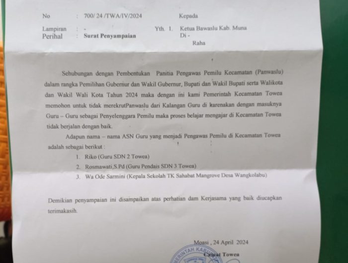 Bersamaan dengan jadwal seleksi panwascam existing yang dimulai sejak 23 April – 27 April 2024, Camat Towea mengeluarkan surat penyampaian yang ditujukan kepada Ketua Bawaslu Muna untuk tidak merekrut panwaslu dari kalangan guru.