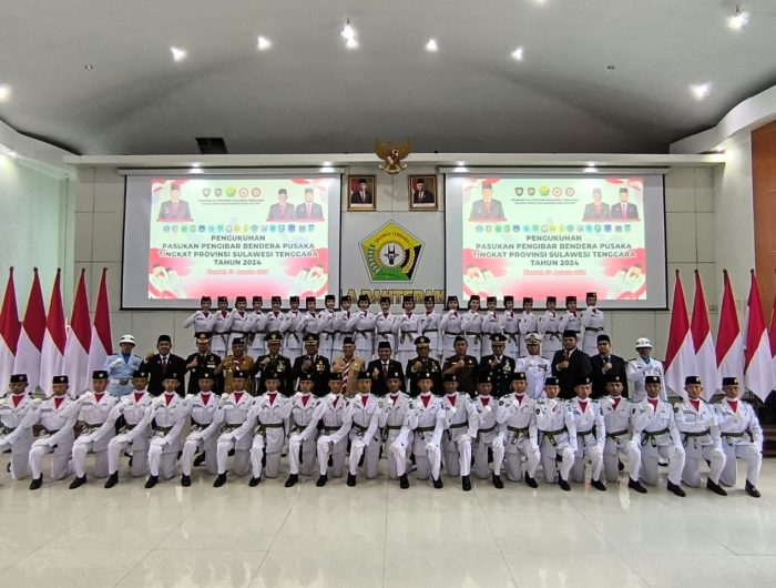 KENDARI, EDISIINDONESIA.id – Penjabat (Pj) Gubernur Sulawesi Tenggara (Sultra), Andap Budhi Revianto mengukuhkan 43 anggota Pasukan Pengibar Bendera Pusaka (Paskibraka) Provinsi Sultra, Kamis (15/8/2024).