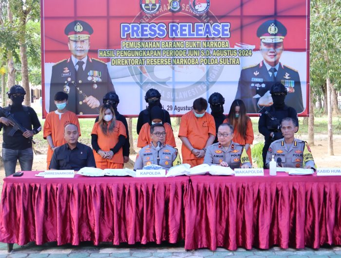Diinformasikan, usai menggelar konferensi pers untuk mengungkapkan hasil operasi pemberantasan tindak pidana narkotika yang dilakukan selama periode Juni hingga Agustus 2024 ini, Polda Sultra kemudian melakukan pemusnahan barang bukti sebagai bagian dari upaya penegakan hukum yang tegas terhadap kejahatan narkotika. (**)