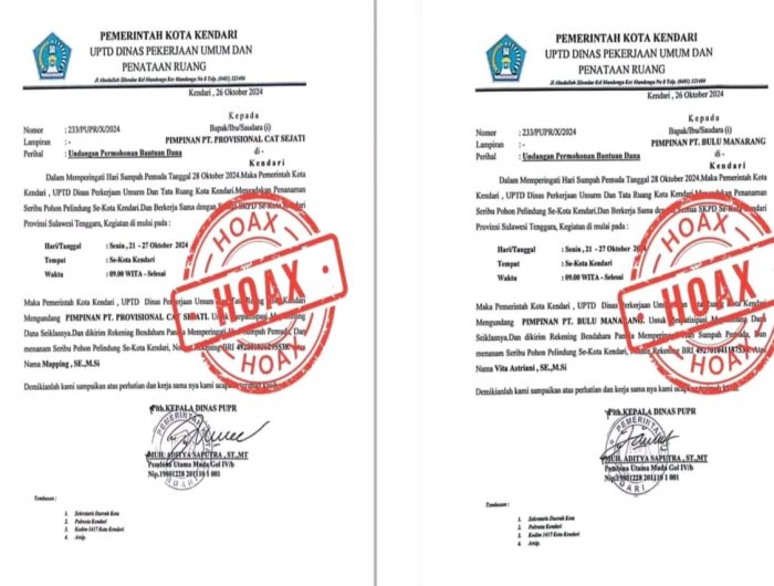 Baru-baru ini, sejumlah surat permintaan sumbangan yang menggunakan kop surat Dinas PUPR dan Dinas Perumahan tersebar di masyarakat. Pemerintah Kota Kendari dengan tegas menyatakan bahwa surat-surat tersebut adalah hoax dan tidak berasal dari instansi pemerintah.