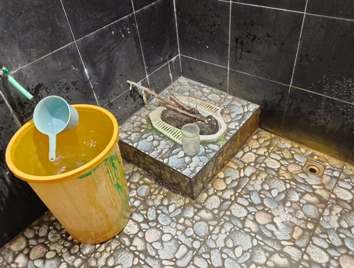 Pantauan media pada 21 Januari 2025 menunjukkan bahwa saluran pembuangan (closed) di kamar mandi tersebut telah tertutup tanah dan ditanami ubi.