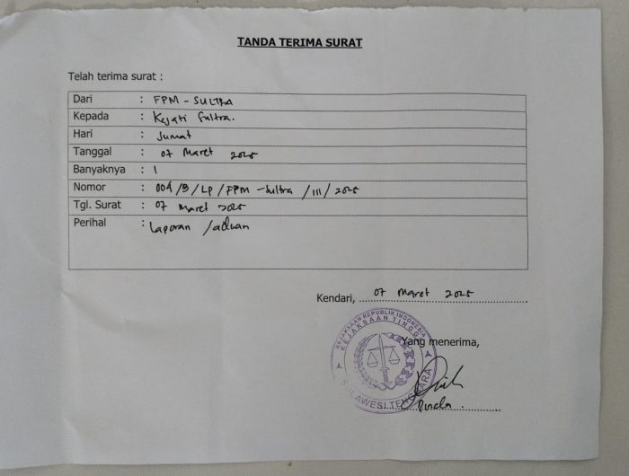 Laporan ini disampaikan oleh Forum Pemerhati Masyarakat Sulawesi Tenggara (FPM-Sultra) pada (7/3/ 2025)