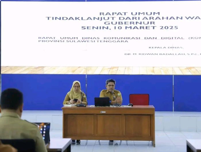 KENDARI, EDISIINDONESIA.id- Kepala Dinas Komunikasi dan Informatika (Kominfo) Provinsi Sulawesi Tenggara, Dr. M. Ridwan Badallah, S.Pd., MM., menggelar rapat tindak lanjut arahan Wakil Gubernur (Wagub) Sultra, Ir. Hugua, M.Ling., yang disampaikan dalam apel gabungan. Rapat di Aula Mepokooaso dihadiri Sekretaris Dinas, para Kepala Bidang, Pejabat Fungsional, Kasubag Umum, PPPK, dan seluruh jajaran Kominfo Sultra.