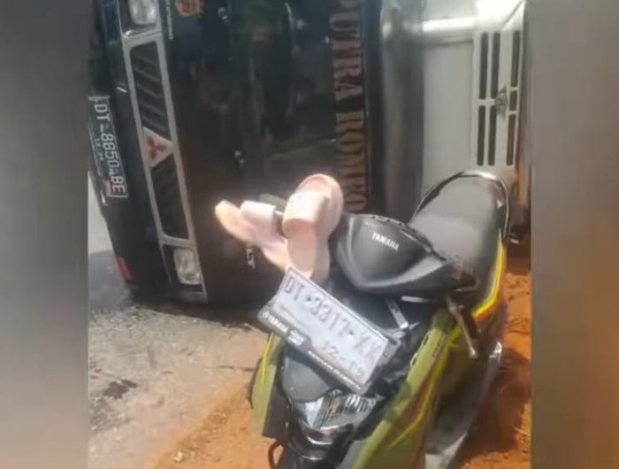 Sebuah mobil Mitsubishi L300 terguling di tikungan dan menimpa sepeda motor Yamaha Gear.