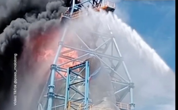 Dalam video yang beredar, asap hitam pekat membumbung tinggi dari salah satu menara struktur baja berwarna biru di area industri. Terekam pula, dua pekerja terjebak di ketinggian saat api mulai menjalar ke bagian atas.