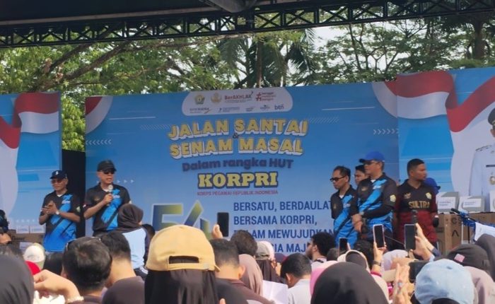 KENDARI, EDISIINDONESIA.id – Gubernur Sulawesi Tenggara (Sultra), Andi Sumangerukka yang lebih akrab disapa ASR, memberikan hadiah kepada aparatus sipil negara (ASN) yang hadir pada perayaan Hari Ulang Tahun (HUT) KORPRI ke-54 di Lapangan Eks MTQ, Minggu (7/12/2025).