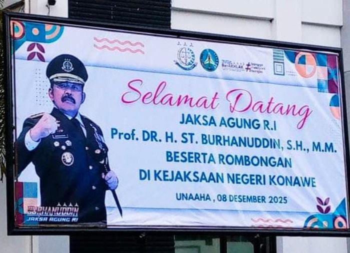 Indikasi kedatangan Jaksa Agung juga terlihat dari adanya baliho penyambutan di depan Kejari Konawe, Unaaha, yang mencantumkan ucapan selamat datang untuk kunjungan hari ini.