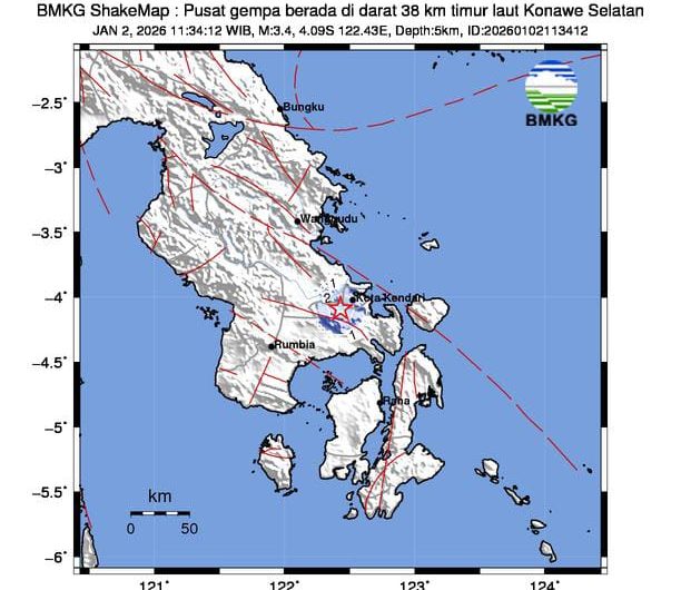 KONSEL, EDISIINDONESIA.id – Gempabumi berkekuatan 3,4 Magnitudo mengguncang Kabupaten Konawe Selatan dan Kota Kendari, Sulawesi Tenggara, Jumat (2/1/2026).
