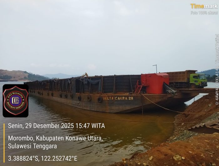Dokumen GPS yang diambil langsung di lapangan pada Selasa (6/1/2026) pukul 08:48 WITA menjadi bukti tak terbantahkan. Di koordinat Lintang -3.400639 dan Bujur 122.240756, terlihat jelas aktivitas loading nikel yang dilakukan secara terbuka. Kapal tongkang TK Chelsea 330 yang ditarik oleh TB Oceania 2000 tercatat sedang mengisi muatan di dermaga lokasi tersebut.