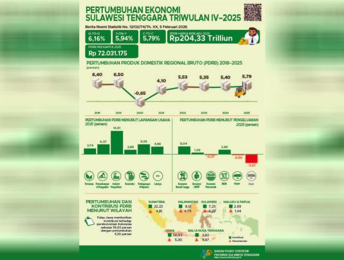 Dilansir dari laman resmi Badan Pusat Statistik (BPS) Sultra, pada periode triwulan IV-2025, ekonomi Sulawesi Tenggara juga mengalami pertumbuhan yang solid. Dibandingkan triwulan IV-2024 (y-on-y), ekonomi Sultra tumbuh sebesar 5,94 persen.
