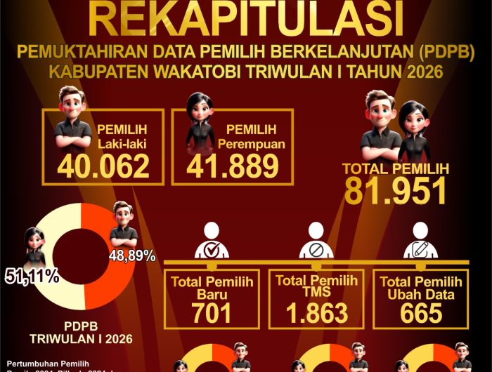 WAKATOBI, EDISIINDONESIA.id– Komisi Pemilihan Umum (KPU) Kabupaten Wakatobi telah menetapkan hasil rekapitulasi Pemutakhiran Data Pemilih Berkelanjutan (PDPB) Triwulan 1 Tahun 2026 melalui Rapat Pleno Terbuka yang berlangsung di Aula Epsilon Kantor KPU Kab. Wakatobi pada Kamis (2/4).